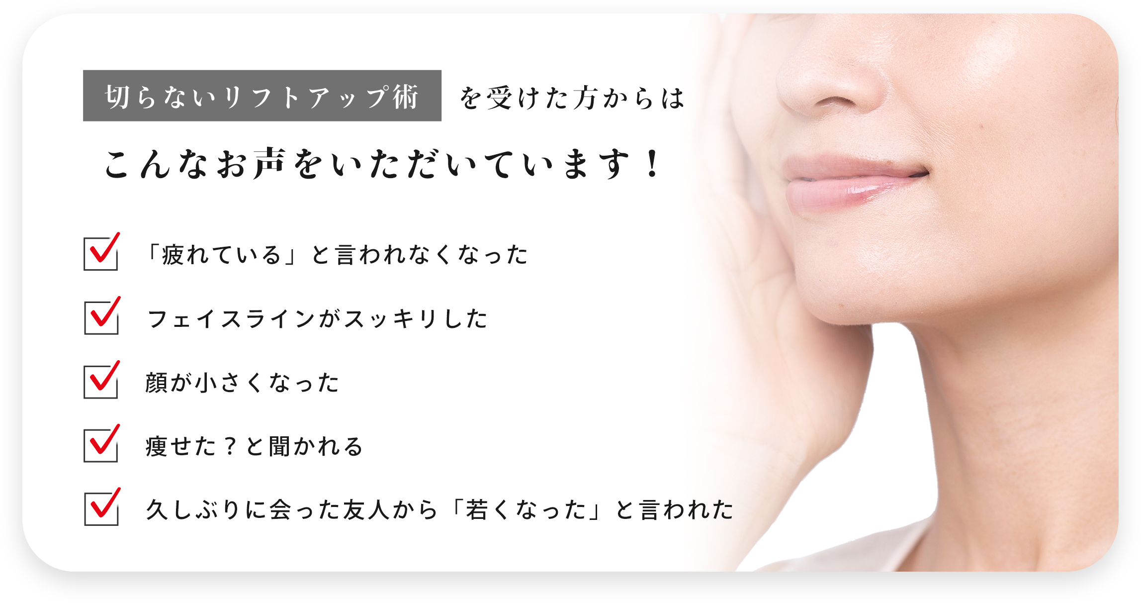 たるみの解消だけでなく、肌のハリやツヤにも評判の高いメニューです。